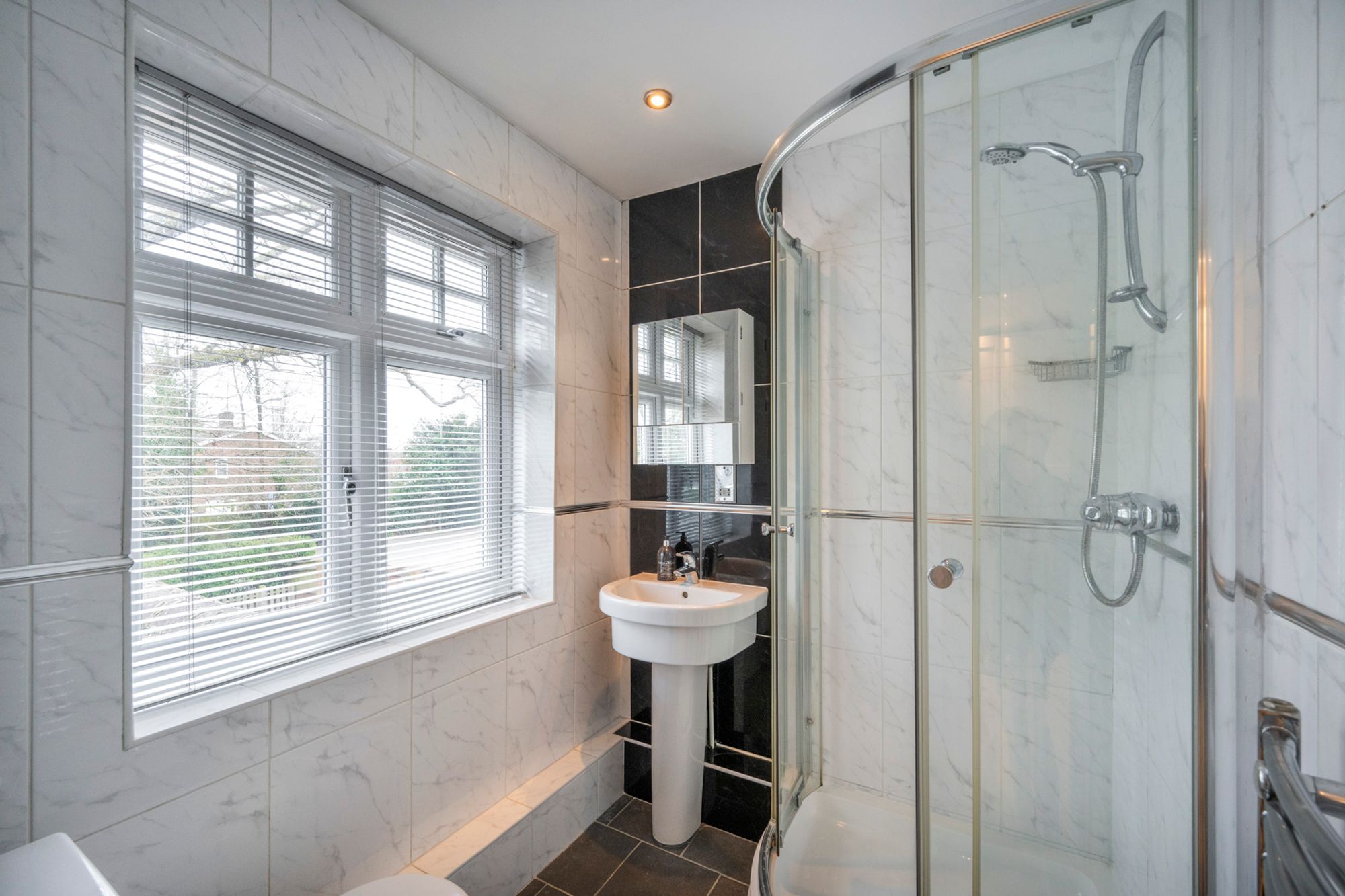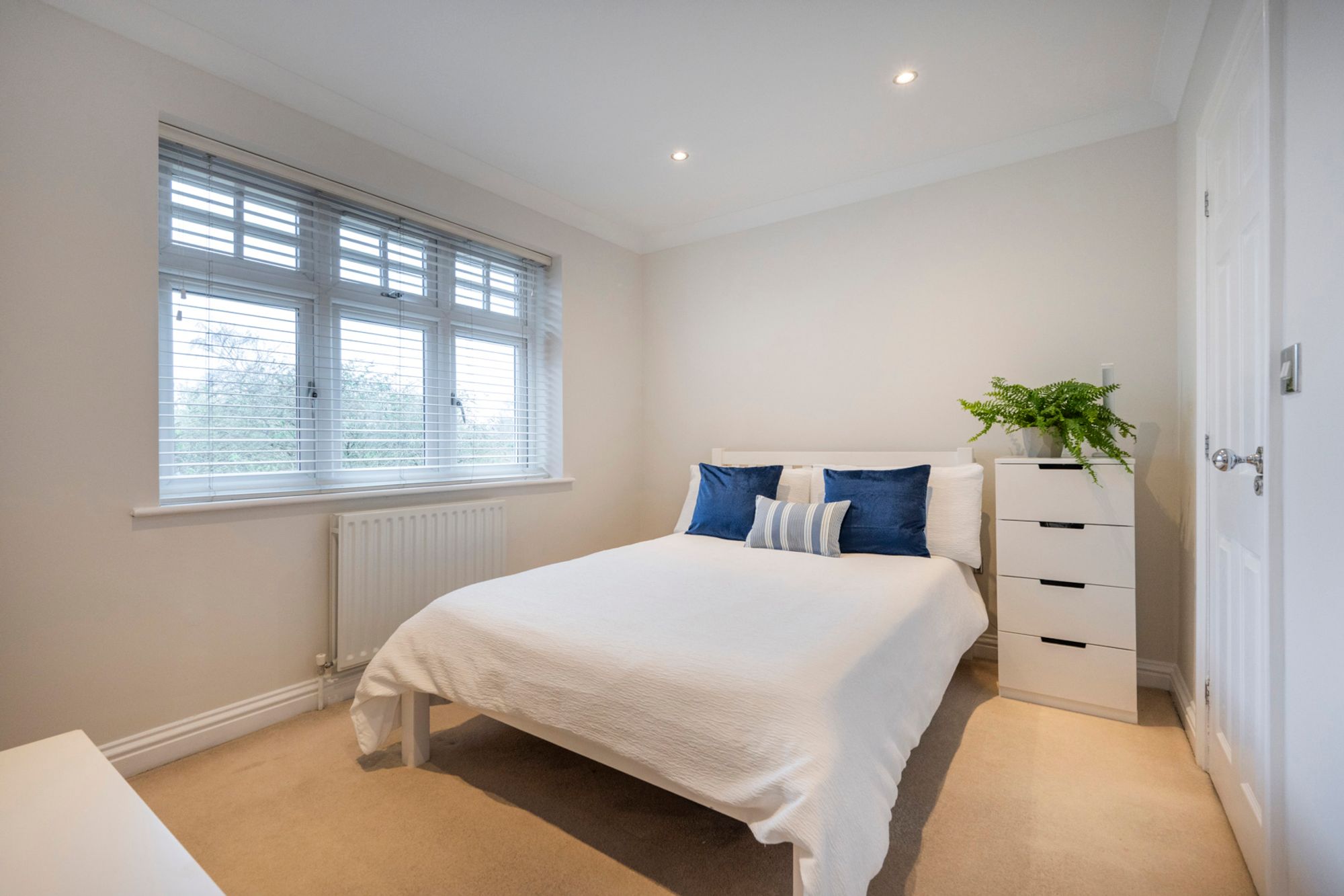 Completing the sleeping quarters, Bedroom Four another double that looks out over the tranquil garden views below. This room offers a unique sense of peace, and its private en-suite features a particularly large shower cubicle, ensuring the same high standard of luxury found throughout the rest of the home.