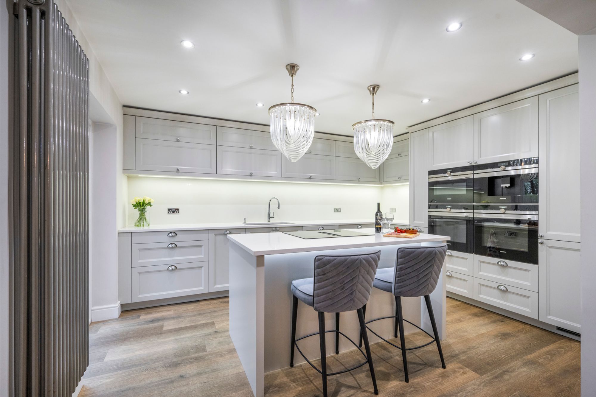 The cabinetry is finished in a sophisticated Utility Grey—a soft-close, German-hinged design with a hue akin to the timeless Ammonite by Farrow & Ball. These are topped with stunning Ice Branco Quartz worktops, providing a crisp, durable surface that sparkles under the light of the Baker & Stonehouse chandeliers—which have been perfectly matched to those over the dining table for a cohesive, designer feel. A back door opens onto the side terrace.