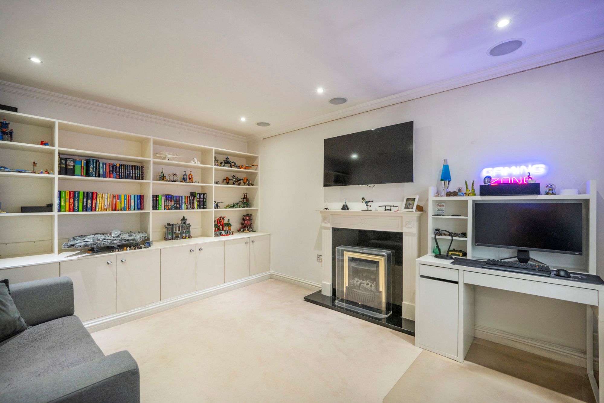 Immediately to the right, you’ll discover a reception room designed for the modern family's changing needs. Whether you envision a high-tech gaming suite, a vibrant playroom, or even a generous fifth bedroom, this space adapts to you. One entire wall is dedicated to a full-height, bespoke-made shelving and cupboard unit, masterfully crafted to keep toys, media, or personal treasures neatly tucked away. With built-in speakers ready to set the mood and a classic gas fireplace, (not currently in use) it’s a room that effortlessly transitions from a lively afternoon hub to a cozy evening retreat.
