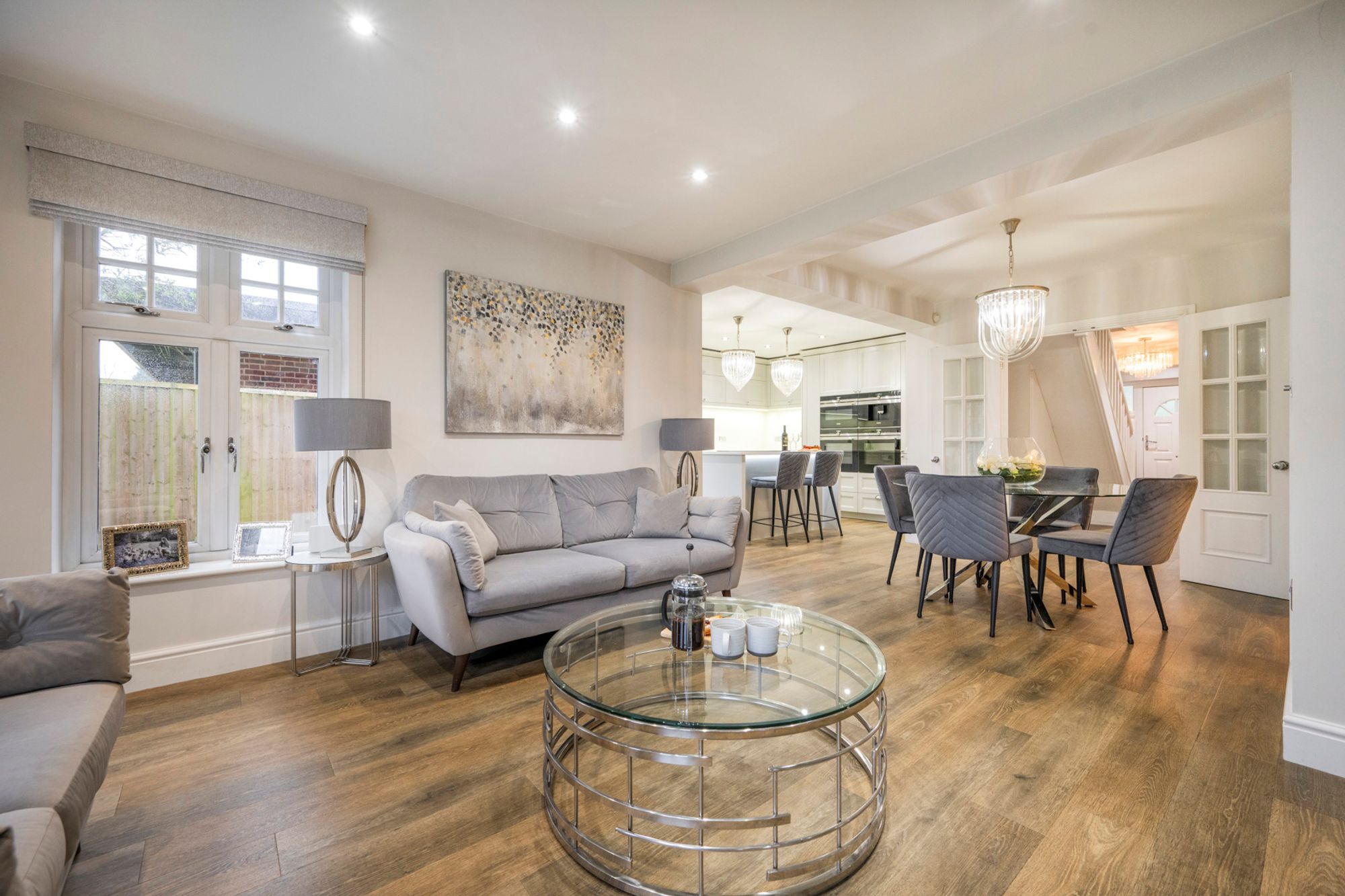 While the open-plan hub is the heart of the home, Aprildene also offers a sophisticated retreat for those more formal occasions or quieter evenings. Transitioning through another set of glazed double doors and an intimate inner hallway/ snug area, you enter into the primary Living Room.